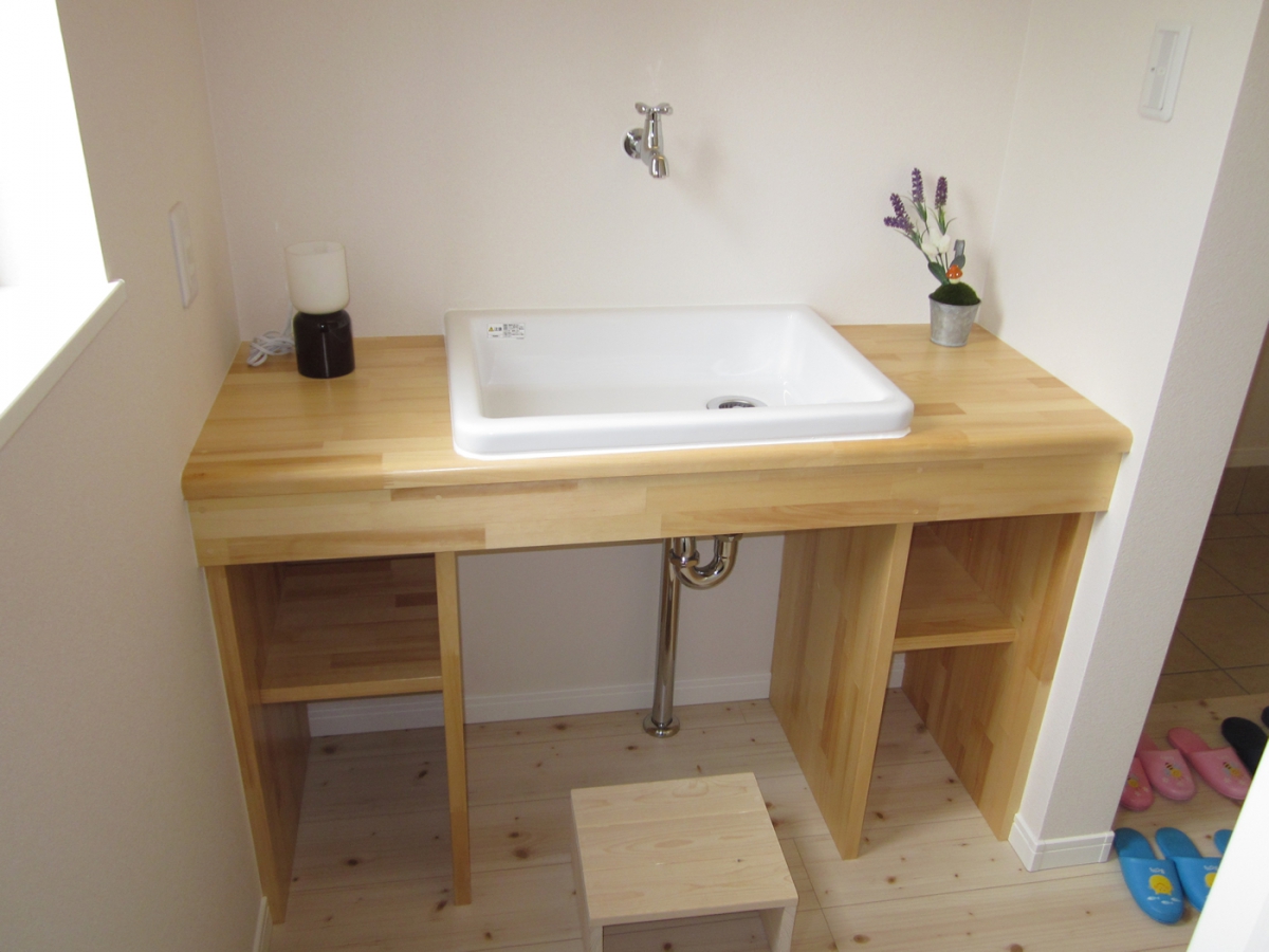 帰ってきてすぐに手洗い、うがいができるように玄関に洗面所を設置。