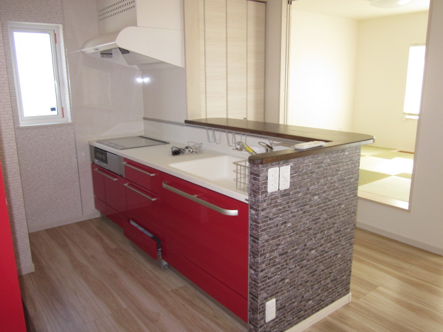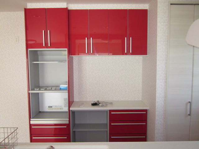 紅色の鮮やかなキッチンです