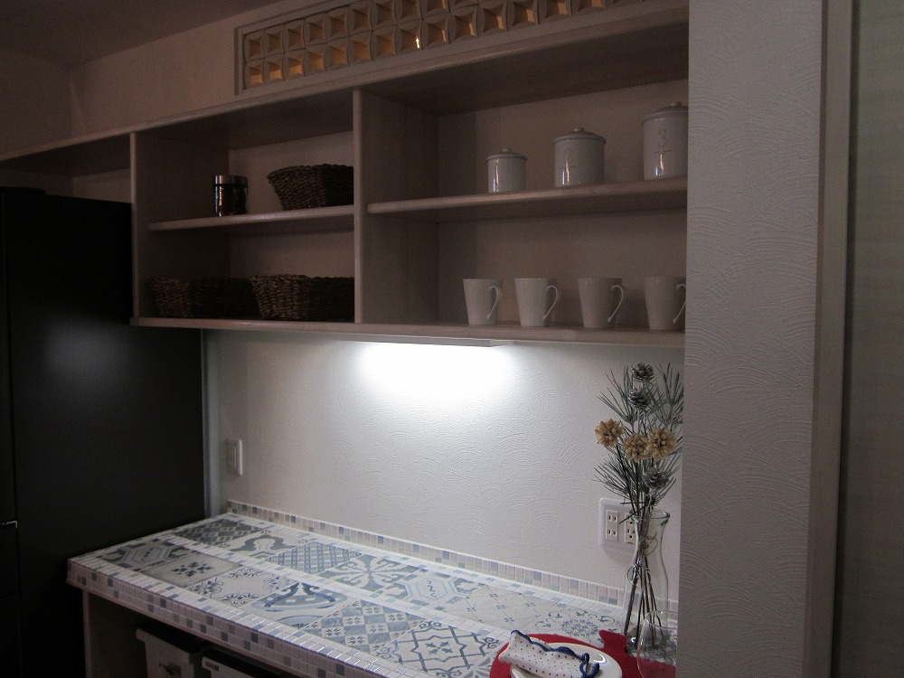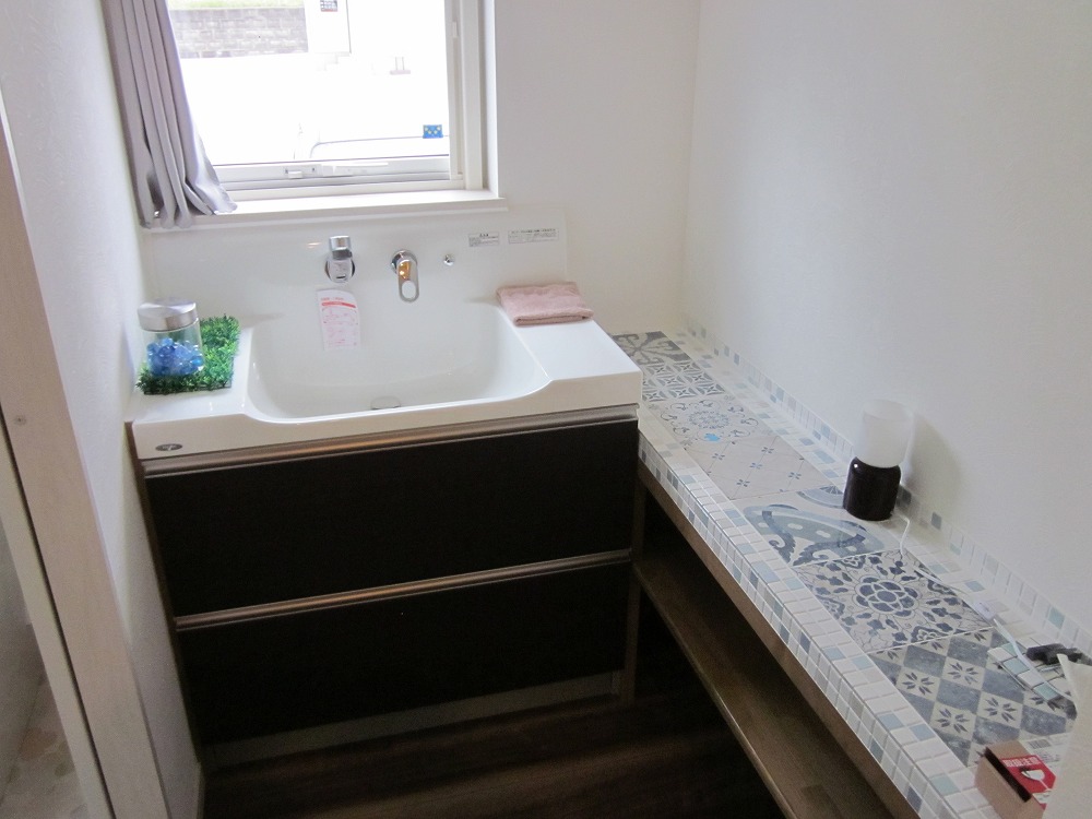 キッチンで残ったタイルを、トイレ前の手洗いカウンターにも