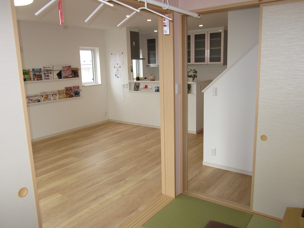 和室の2方向のドアを開けると、リビング・キッチンと続く広々空間