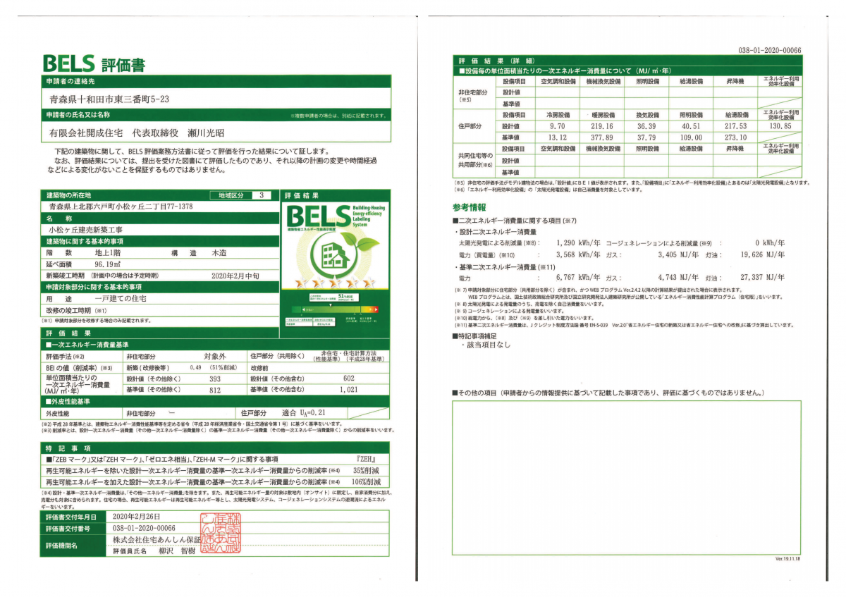 住宅の省エネ性能を評価する、BELS評価書です。