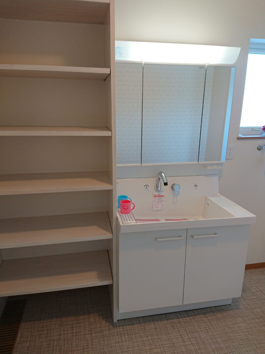 W900のゆったり洗面化粧台と、造作収納棚