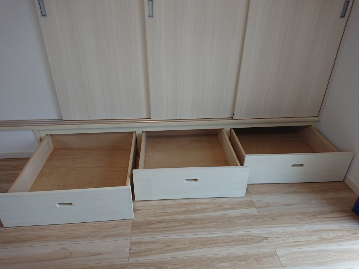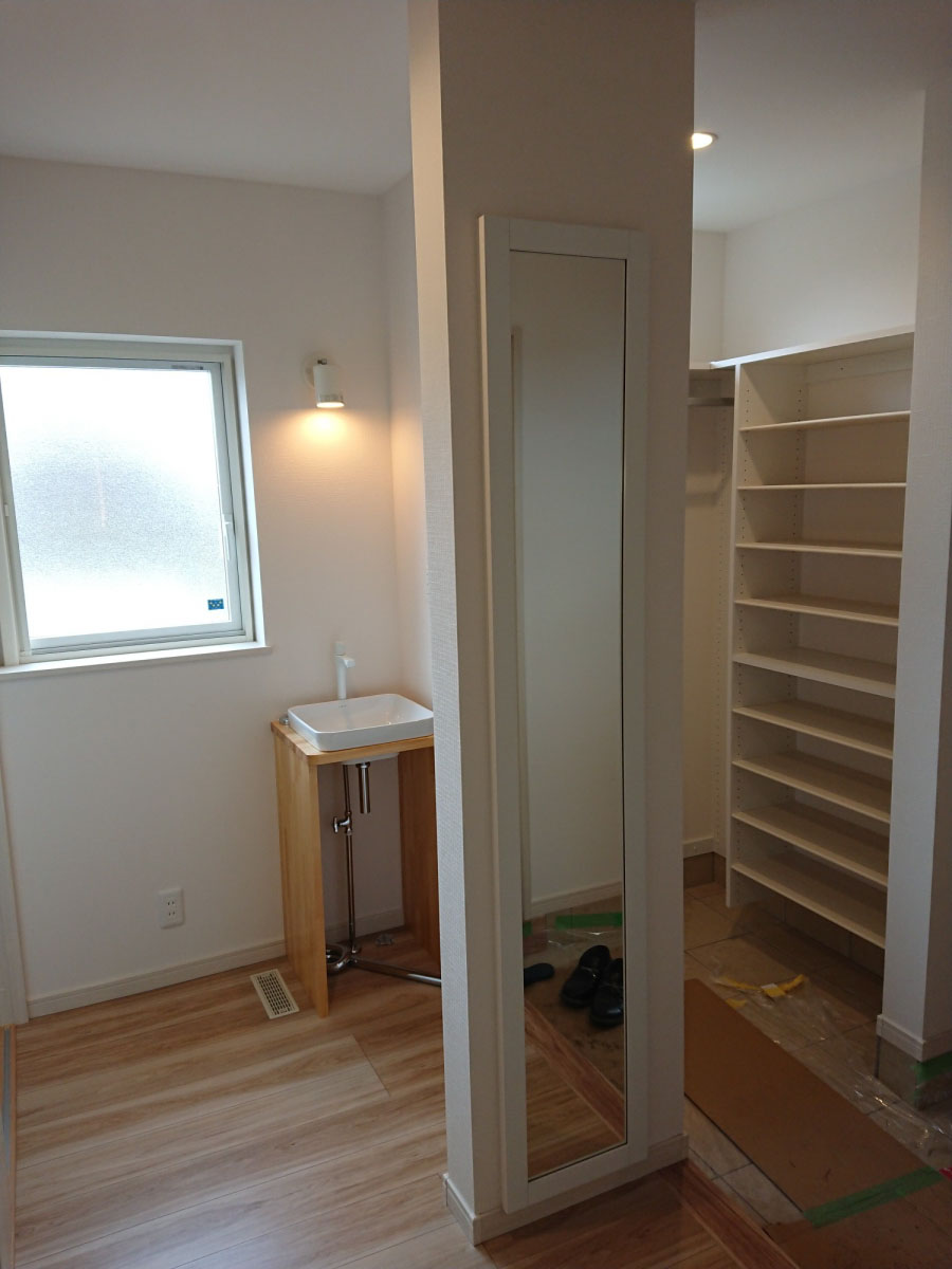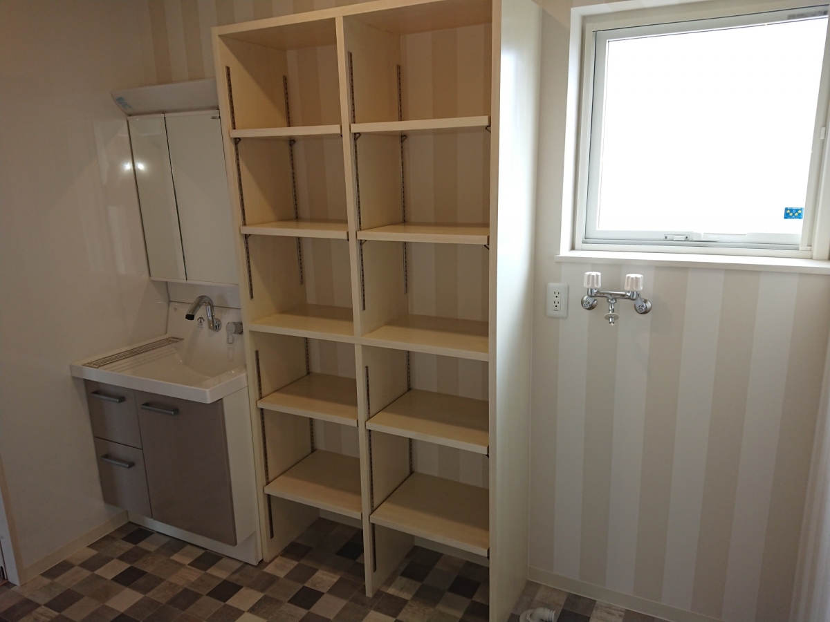 洗面化粧台の隣には、大工さん手作りの収納棚。