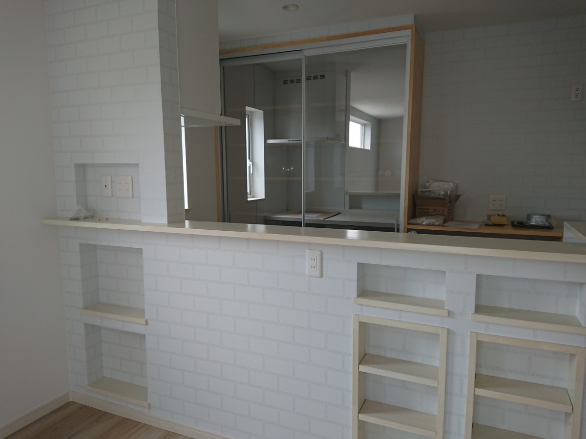 キッチンカウンター前には、小物入れのニッチや本棚を造作しました。