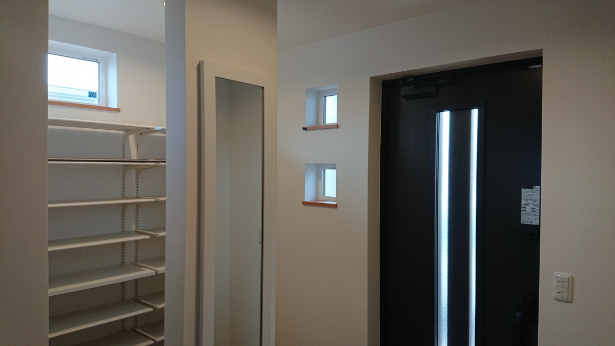 玄関には、人気のカガミ付スリッパ収納とシューズクローク