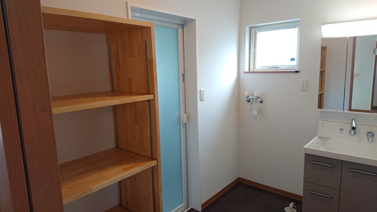 洗面脱衣室には、3面鏡の洗面台と大工さん造作の収納棚。