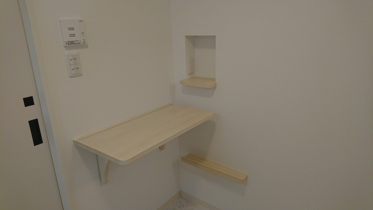 洗面室には、奥様のリクエストで折り畳み式のアイロン台を作りました。