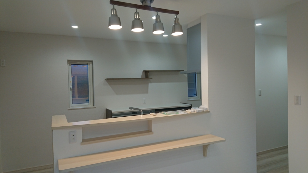 キッチンは奥様希望のL型水栓と食洗機付きでカップボードとおそろいです。