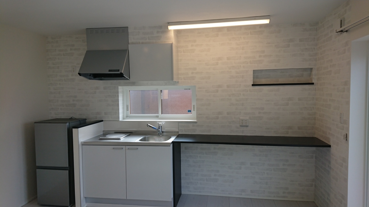 コンパクトキッチンにカウンターとニッチを造作しました。