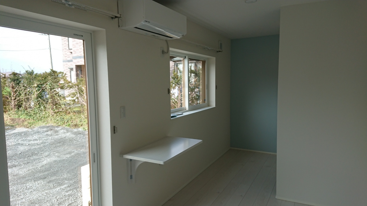 掃き出し窓の隣には、折り畳み式カウンター造作で、ワークスペースとしてつかえます。