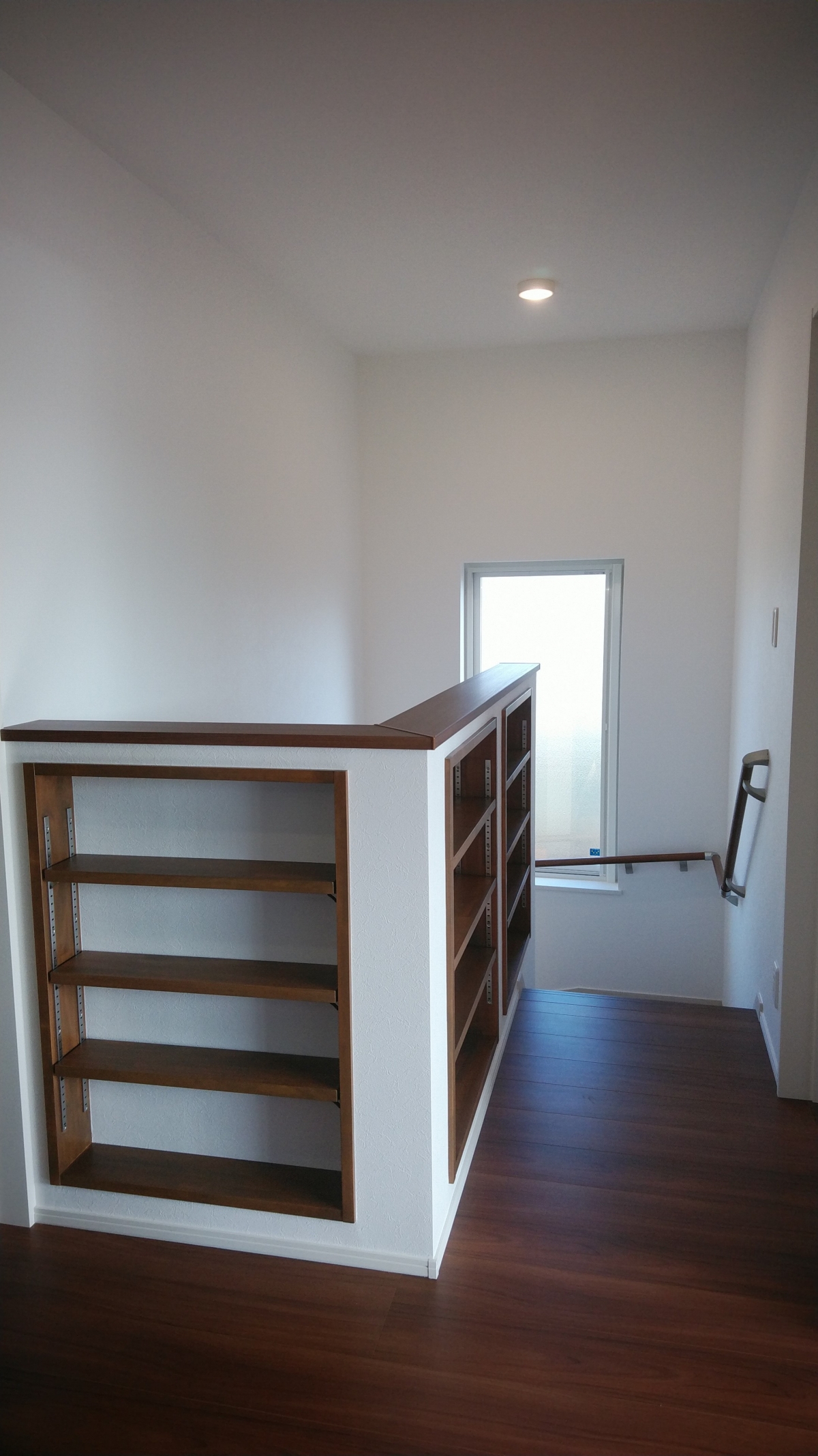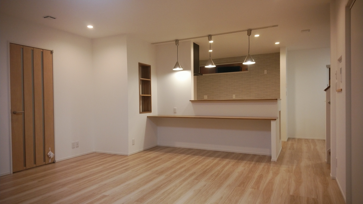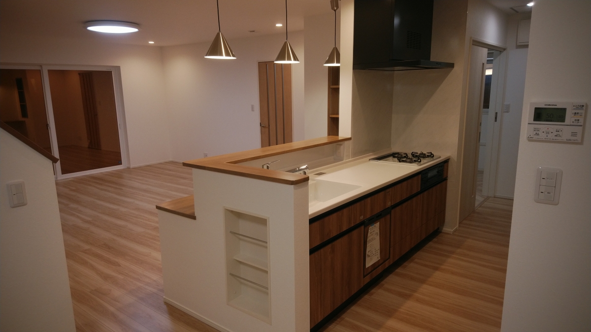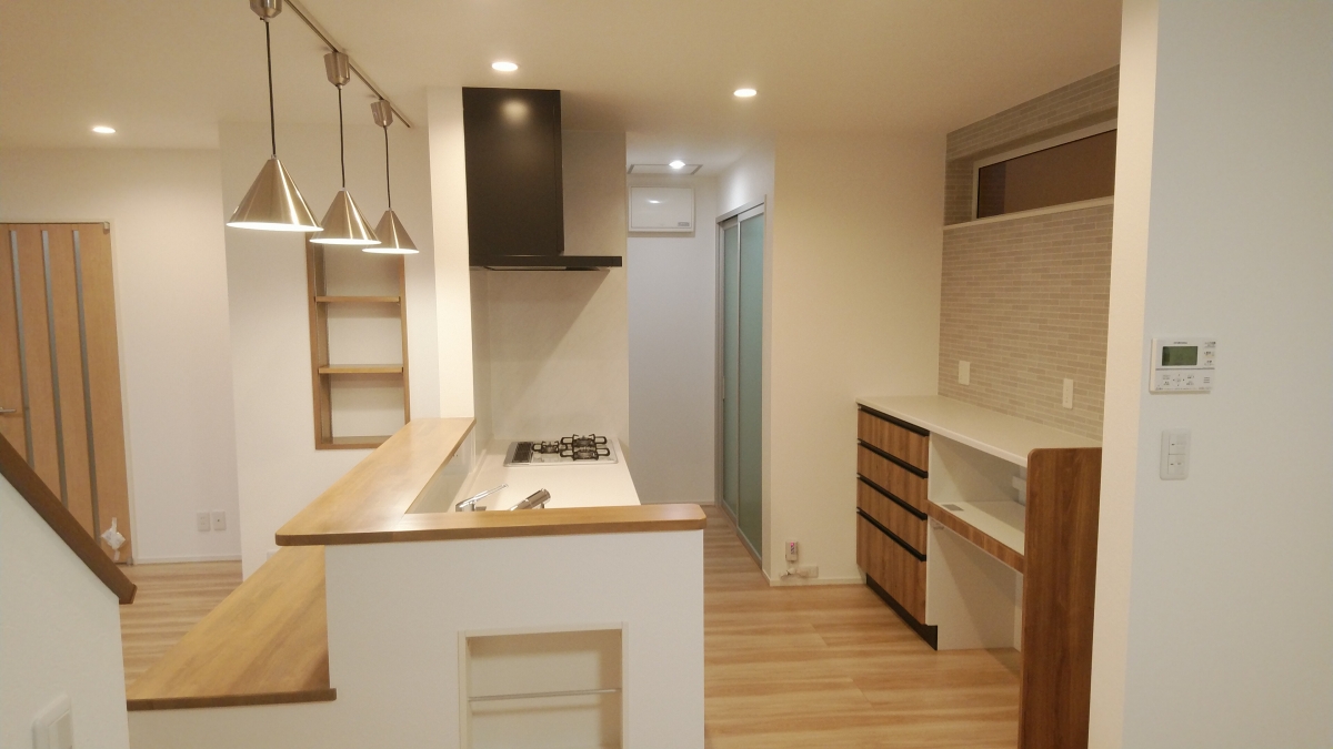 リビングから見たペニシュラン型キッチン 奥行45cmのカウンターを付けました