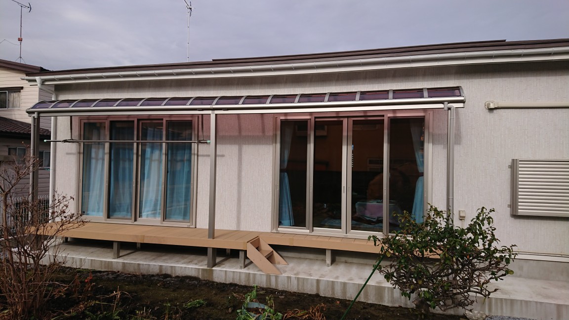 リビング前にウッドデッキとテラス屋根を設置、お庭を眺めながらちょっと休憩を。