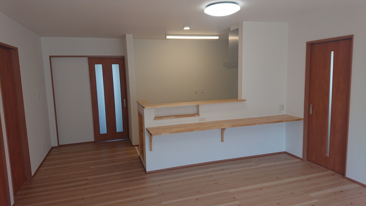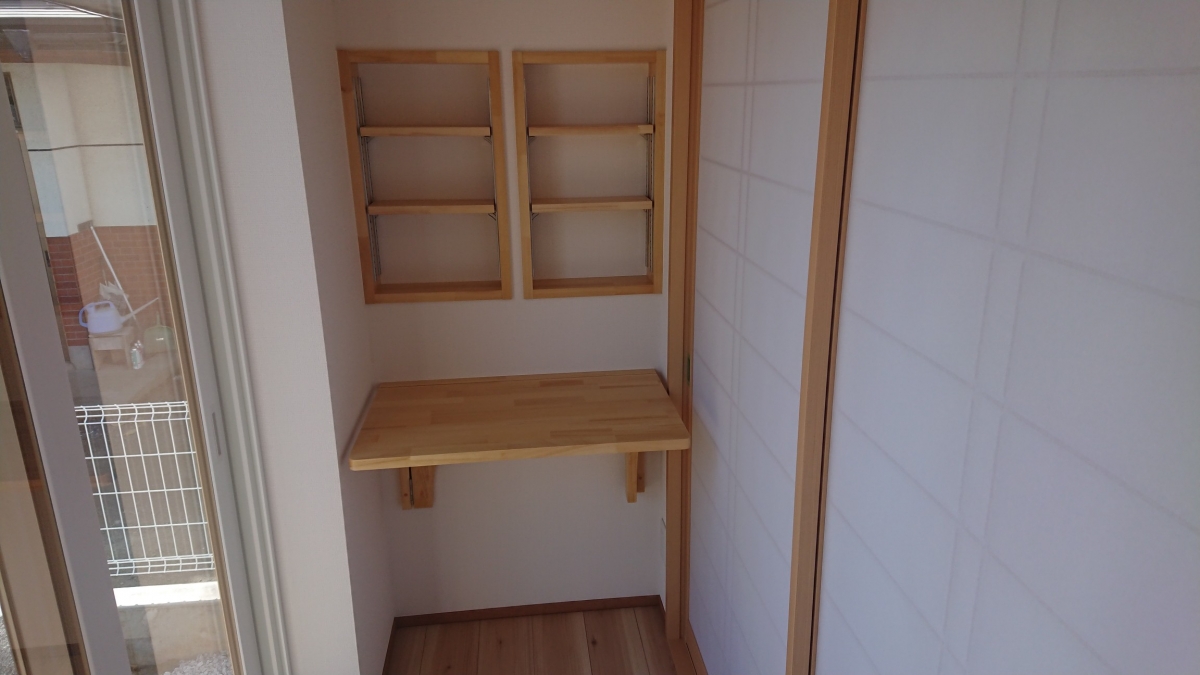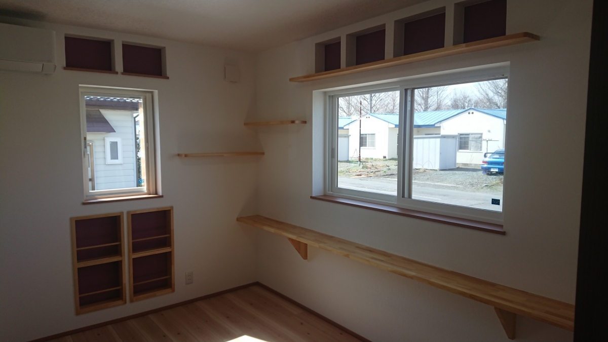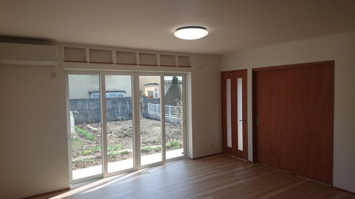 リビングには明るい大きな窓と、上部には収納棚を作りました。
