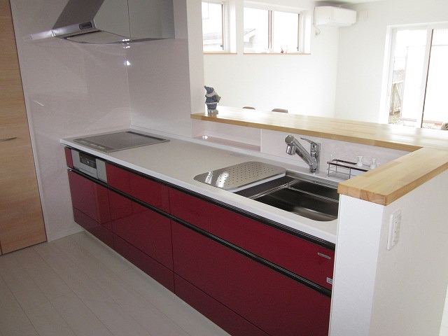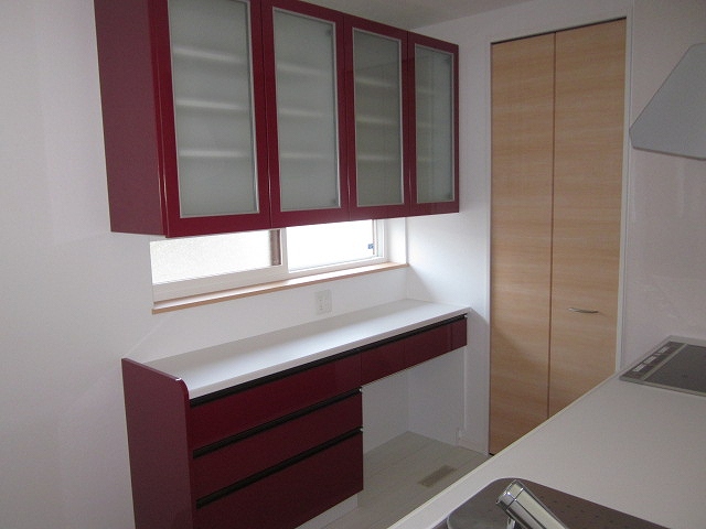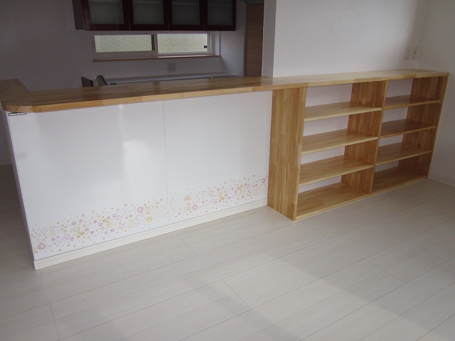 キッチン前には、タカラのホーローパネルと収納棚を造作